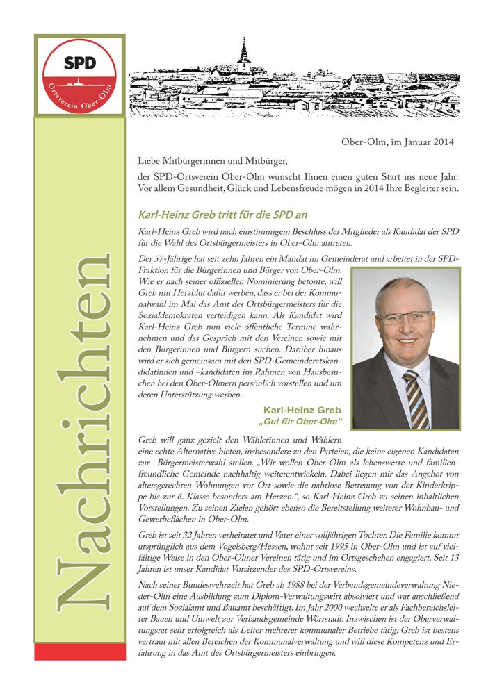 Karl-Heinz Greb möchte mit ihrer Hilfe unser Ober-Olm als lebenswerte und familienfreundliche Gemeinde weiterentwickeln. Lesen Sie mehr über seine Ziele in unserem aktuellen SPD-Nachrichtenblatt.