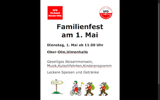 Zur traditionellen Maifeier laden der SPD-Verband Nieder-Olm und der Ortsverein Ober-Olm alle Mitglieder mit Angehörigen, Freunde und Gönner sowie alle Bürgerinnen und Bürger ganz herzlich ganz herzlich ein. Bei leckeren Speisen und Getränken wollen wir ein paar nette Stunden verbringen, es gibt Musik,Planwagenfahrten und Unterhaltung für die Kinder. Wir freuen uns auf Euren Besuch!